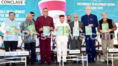 Photo Caption : Governor of Karnataka Thaawar Chand Gehlot with Prof. C Rajkumar, Founding Vice Chancellor, OP Jindal Global University, Dr. AVS Murthy, RK University, Justice Michael D Wilson, Former Judge, Supreme Court of Hawai, USA, Prof. R Padmanabha, Dean, Office of Academic Governance, JGU and Prof. R Sudarshan, Dean, Jindal School of Government during the inauguration of "Bengaluru Sustainability Conclave" at a private hotel, in Bengaluru on Tuesday 3rd June 2025