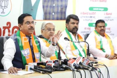 Photo Caption : Union Minister Pralhad Joshi with BJP leaders Govind M Karjol, Raju Gowda and others during a press conference at BJP office, in Bengaluru on Tuesday 10th June 2025