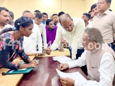 Minister KJ George receiving public grievances and petitions at his office, Sarvagna Nagar, in Bengaluru on Saturday 14th June 2025