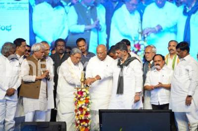 Photo Caption : Leader of the Opposition in the Rajya Sabha, AICC President Mallikarjun Kharge with CM Siddaramaiah, DCM D.K. Shivakumar, Ministers and MLAs during the foundation stone laying ceremony for various works of the Health Department under the ‘Arogya Avishkar’ (Health Innovation) scheme at the Yadgir District Stadium, in Yadgir on Saturday 14th June 2025