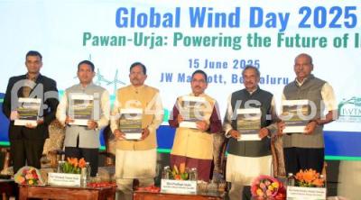 Union Minister of New and Renewable Energy Shri Pralhad Joshi with Minister KJ George and others seen during the Global Wind Day 2025 Conference at JW Marriott Hotel, in Bengaluru on Sunday 15th June 2025
