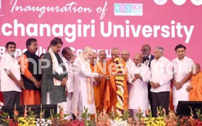 Photo Caption : Amit Shah, Minister of Home Affairs of India with Sri Nirmalananda Swamiji, Union Ministers HD Kumarswamy, V Somanna, Minister Sharan Prakash Patil and others during the inauguration of Adichunchanagiri University at Nagarur, North District, in Bengaluru on Friday 20th June 2025