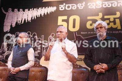 Photo Caption : BJP Central Parliamentary Board Member and Former CM BS Yediyurappa with Journalist Swaminathan Gurumurthy and Retired Chancellor Prof Vishnukanth Chatpalli during the “50 Years of the 1975 Emergency” program at Town Hall, in Bengaluru on Tuesday 24th June 2025
