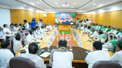 Photo Caption : DCM DK Shivakumar meeting with Mandya District In-charge Minister Chaluvarayaswamy, Minister Shivaraj Thangadgi, MLA Ramesh Bandisidde Gowda, Legislative Council Member Dinesh Gooli Gowda, farmer leaders, other organization leaders and public representatives of Mandya district on the importance of the historic Cauvery Aarti program at Vidhana Soudha, in Bengaluru on Wednesday 25th June 2025