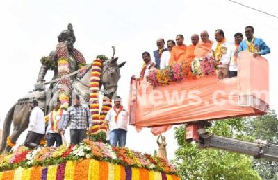 Photo Caption : Sri Nanjavadutha Swamiji, Sri Nischalananda Swamiji, Former Union Minister DV Sadananda Gowda and others garlanding the statue of Nadaprabhu Kempegowda on his 516th birth anniversary at Vokkaliga Association , in Bengaluru on Friday 27th June 2025