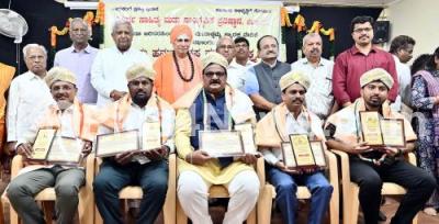Sri Shivarudra Swamiji of Belimutt presenting "Halluru Hanumanthappa" and "Varamahalakshmi" state award during the award presentation program organised by Samartha Sahitya and Samskrutika Pratishtana at Kannada Sahitya Parishat, also seen are Dr. PH Ragavendra Shetty, D Subramanya Shetty, SR Vijaya Samartha and others , in Bengaluru on Sunday 6th July 2025