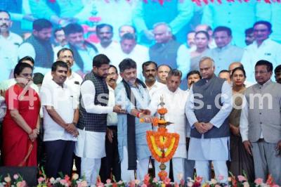 Photo Caption : DCM DK Shivakumar with Ministers KH Muniyappa, Priyank Kharge, MLAs Sharath Bachegowda, Nelamangala Srinivas, MLC S Ravi and others during the distribution of e property and title deeds program organized in Hoskote, Bengaluru Rural, in Hoskote on Sunday 20th July 2025