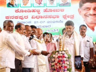 Photo Caption : DCM DK Shivakumar with MLA Iqbal Hussain and others during the Government at Your Doorstep program at Kodihalli, Kanakapura, in Kanakapura on Monday 21st July 2025