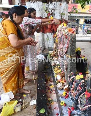 Event Description : People offer pooja at Panchalingeshwara temple at Palace Guttahalli on the occasion of Nagarpanchami, in Bengaluru on Monday 28th July 2025