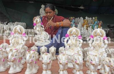 Photo Caption : An artist gives a final touch to Lakshmi idols for the upcoming Varamahalakshmi festival at Magadi Road, in Bengaluru on Monday 28th July 2025
