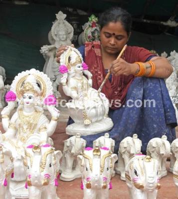 Event Description : An artist gives a final touch to Lakshmi idols for the upcoming Varamahalakshmi festival at Magadi Road, in Bengaluru on Monday 28th July 2025