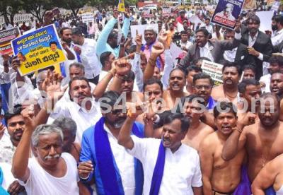 Photo Caption : Members of Karnataka Madiga Dandora Community Organizations in Karnataka State led by Former Union Minister A Narayanaswamy staging a protest at Freedom Park, demanding implementation of Scheduled Caste reservation, in Bengaluru on Friday 1st August 2025