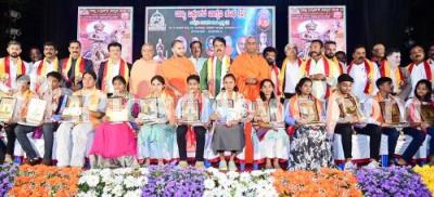 Photo Caption : Sri Nanjavadutha Swamiji and Sri Nischalananda Swamiji presenting Pratiba puraskar to the SSLC and PUC toppers during the "Vokkaliga Rathna" award presentation program at Kuvempu Kalakshetra, also seen are MLA R Ashoka, Rajya Sabha member Jaggesh and others , in Bengaluru on Saturday 2nd August 2025