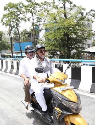 Photo Caption : DCM DK Shivakumar riding a scooter during the inspection of the development works of Hebbal Flyover with Minister Byrathi Suresh, BDA President, MLA NA Harris, Additional Chief Secretary of the Urban Development Department and GBA Administrator Tushar Girinath, in Bengaluru on Tuesday 5th August 2025