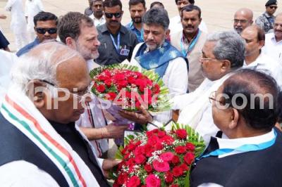 Photo Caption : AICC President Mallikarjuna Kharge and Leader of the Opposition in the Lok Sabha Rahul Gandhi being welcomed by Chief Minister of Karnataka Siddaramaiah, DCM, KPCC President DK Shivakumar and Randeep Surjeewala at HAL airport, in Bengaluru on Friday 8th August 2025