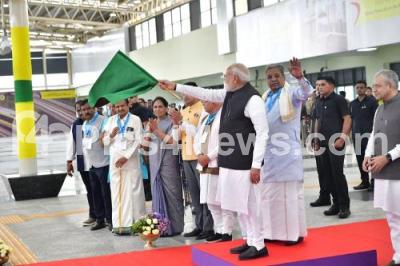 Event Description : Prime Minister Narendra Modi during the flag off ceremony of the Namma Metro Yellow line at the Ragigudda Metro Railway Station, also seen are Chief Minister of Karnataka Siddaramaiah, DCM DK Shivakumar, Governor of Karnataka Thawar Chand Gehlot, Union Ministers Shobha Karandlaje, V Somanna and others , in Bengaluru on Sunday 10th August 2025