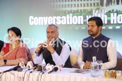 Photo Caption : IT BT Minister Priyank Kharge with MLA Sharath Bachegowda and IT BT Secretary Ekroop Kaur during a press meet on Bengaluru Tech Summit 2025 at a private hotel, in Bengaluru on Monday 11th August 2025