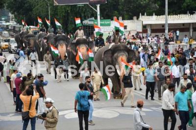 Dasara jamboo savari elephants strolling around the Mysuru City with Indian National Flags for Independence Day Celebration, ahead of Mysuru Dasara jamboo savari procession, in Bengaluru on Thursday 14th August 2025