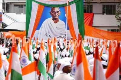 Photo Caption : KPCC President DK Shivakumar with Chief Minister of Karnataka Siddaramaiah and Congress leaders during the Independence Day celebration at KPCC office, in Bengaluru on Friday 15th August 2025