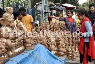 Photo Caption : Eco Friendly Gowri and Ganesha idols selling for the Ganesha Festival at RT Nagar, in Bengaluru on Monday 25th August 2025