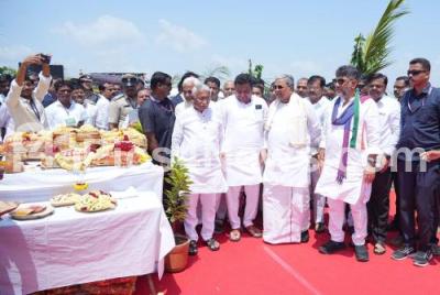 Photo Caption : CM Siddaramaiah and DCM DK Shivakumar offered bagina to Almatti reservoir, in Bijapur on Saturday 6th September 2025