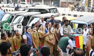 Photo Caption : MLA and BDA Chairman NA Haris with lady auto rickshaw drivers during auto drivers skills training for women and transgender by B Pac at Rangoli Art Centre Metro Station on MG Road, in Bengaluru on Saturday 13th September 2025