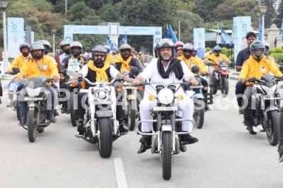 Photo Caption : DCM DK Shivakumar riding a bike from Kanteerava Stadium to Vidhana Soudha during the bike rally as part of "International Democracy Day", in Bengaluru on Monday 15th September 2025