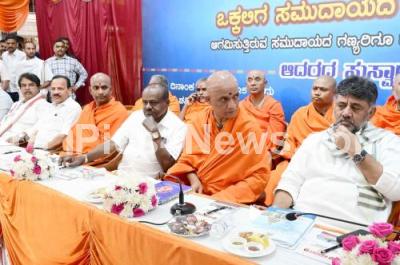Photo Caption : Sri Nirmalanandanath Swamiji of Adi Chunchanagiri, Sri Nanjavadhuta Swamiji of Sri Spatikapuri Mutt, Sri Nishchalanandanath Swamiji, DCM DK Shivakumar, Union Minister HD Kumaraswamy, Leader of the Opposition in the Legislative Assembly Ashok, Ministers Chaluvarayaswamy, Sudhakar, Former CM DV Sadananda Gowda, DCM Ashwath Narayan, President of the Vokkaligara Sangha Kenchappa Gowda, MPs, MLAs, Legislative Council members, Former MPs, Former MLAs and other leaders during the Vokkaliga Community Consultation meeting on Karnataka State Caste Census, in Bengaluru on Saturday 20th September 2025