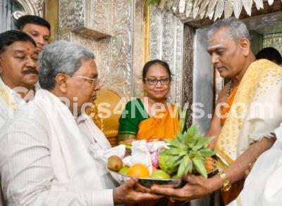 Photo Caption : Chief Minister of Karnataka Siddaramaiah with Writer Banu Mushtaq offering pooja at Goddess Chamundeshwari Temple during the inauguration of Nada Habba Dasara Festival, in Mysuru on Monday 22nd September 2025