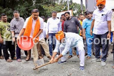 Event Description : BJP leaders filling potholes with the concrete mixer, to condemn the state Congress government negligence for not clearing the potholes, in Bengaluru on Wednesday 24th September 2025