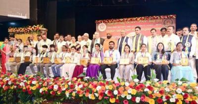 Photo Caption : SSLC and PU toppers being felicitated with Prathiba Puraskara during the program organised by Karnataka Rajya Devanga Naukarara Sangha, also seen are Justice Vedavyasachar Srishananda, Prasanna Kumar, Nagesh Kumar, President, Karnataka Rajya Devanga Naukarara Sangha, Former Minister Umashree, Former MLC MD Lakshmi Narayana and others at Ravindra Kalakshetra , in Bengaluru on Sunday 28th September 2025
