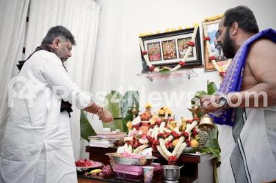 Photo Caption : DCM DK Shivakumar performing pooja at his office at Vidhana Soudha, in Bengaluru on Tuesday 30th September 2025