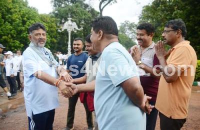 Photo Caption : DCM D K Shivakumar interacts with walkers and citizen of Bengaluru during Walk with Bengaluru Citizens program at Lalbagh, in Bengaluru on Saturday 11th October 2025