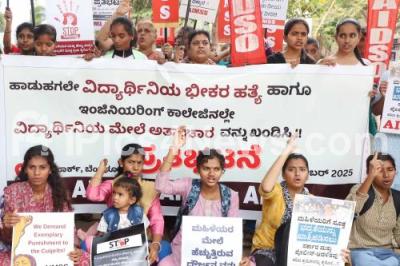Photo Caption : Members of AIMSS, AIDSO, AIDYO staging a protest at Freedom Park, condemning the murder and rape of female students in the bengaluru city, in Bengaluru on Saturday 18th October 2025