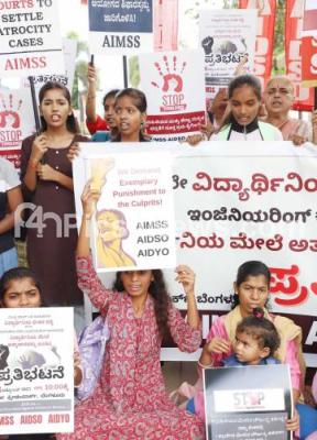 Members of AIMSS, AIDSO, AIDYO staging a protest at Freedom Park, condemning the murder and rape of female students in the bengaluru city, in Bengaluru on Saturday 18th October 2025