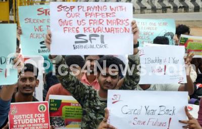 Photo Caption : Members of Students Federation of India protest against Higher education department of Karnataka, demanding to immediately abolition of year back system, provision of carryover to all semester and other various demands at freedom park, in Bengaluru on Friday 24th October 2025