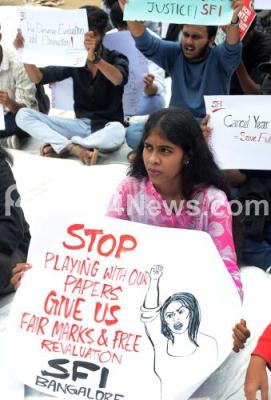 Photo Caption : Members of Students Federation of India protest against Higher education department of Karnataka, demanding to immediately abolition of year back system, provision of carryover to all semester and other various demands at freedom park, in Bengaluru on Friday 24th October 2025