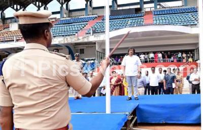 Event Description : Minister Madhu Bangarappa saluting during the rehearsal for the Kannada Rajyotsava celebrations at Kanteerava Stadium, in Bengaluru on Thursday 30th October 2025