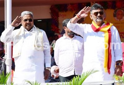 Photo Caption : Chief Minister of Karnataka Siddaramaiah with DCM D K Shivakumar and others during the "Kannada Rajyotsava" celebrations at Kanteerava Stadium, in Bengaluru on Saturday 1st November 2025