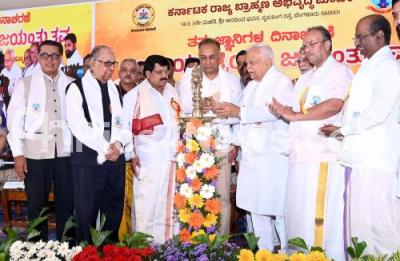 Photo Caption : Minister Dinesh Gundu Rao, MLA RV Deshpande, S Raghunath, President, Akila Karnataka Brahmana Mahasabha, Ashok Harana Halli and others during the "Acharyatrayara Jayntotsava" program organized by Karnataka Rajya Brahamana Abiruddi Mandali at Babkurukamme Seva Samiti, in Bengaluru on Friday 7th November 2025
