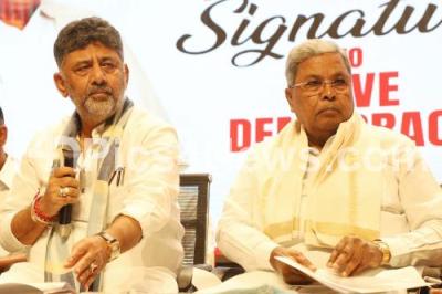 Photo Caption : KPCC President and DCM D K Shivakumar with Chief Minister of Karnataka Siddaramaiah, Congress Ministers, MLAs during the press conference regarding the collection of 1,12,41,000 signatures in the campaign conducted by the Karnataka Pradesh Congress Committee against vote theft in the state, in Bengaluru on Saturday 8th November 2025