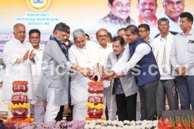 CM Siddaramaiah with DCM DK Shivakumar, Ministers and MLAs during the inauguration of the project to fill water into lakes and various developments work in Kudligi District, in Kudligi on Sunday 9th November 2025