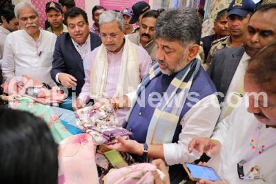 Photo Caption : CM Siddaramaiah and DCM DK Shivakumar inaugurated Kalaloka, a shop selling local products of Karnataka handicrafts, cottage industries, weaving, industry and others, at the Kempegowda International Airport, also seen are Ministers KJ George, MB Patil, KH Muniyappa, Priyank Kharge, Karnataka Handicrafts Development Corporation Chairperson and MLA Rupakala Shashidhar and others, in Bengaluru on Tuesday 11th November 2025