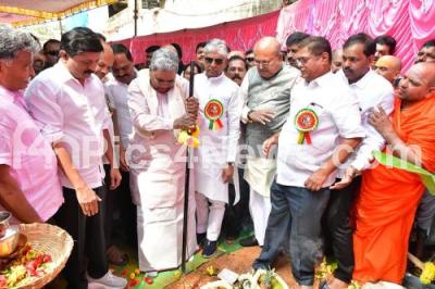 Photo Caption : CM Siddaramaiah with Minister Byrathi Suresh, Former Minister HM Revanna and others during the inauguration of bhoomi pooja for the Kuruba Association at Gandhi Nagar, in Bengaluru on Wednesday 12th November 2025