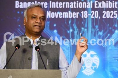 Photo Caption : Minister for IT and BT Priyank Kharge addressing a press conference at a private hotel regarding "Bengaluru Tech Summit 2025" which will be held from Nov 18 to 20 at Bengaluru International Exhibition Centre, in Bengaluru on Monday 17th November 2025
