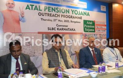Photo Caption : Bhaskar Chakravarthy, Convener SLBC, Shambhu Lal, Chief General Manager Canara Bank Pravesh Kumar, CGM and others during Atal Pension Yojana Outreach Program and state level strategy review meeting, in Bengaluru on Thursday 27th November 2025