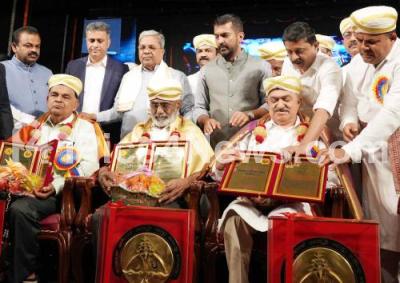 Photo Caption : Chief Minister of Karnataka Siddaramaiah presenting "Arebhashe Academy 2024 Honorary" award presentation program organised by Kannada and Culture Dept and Karnataka Arebashe Culture and Literature Academy Madikeri at Ravindra Kalakshetra, also seen are Minister Byrathi Suresh, MLA Ponnanna and others, in Bengaluru on Sunday 30th November 2025