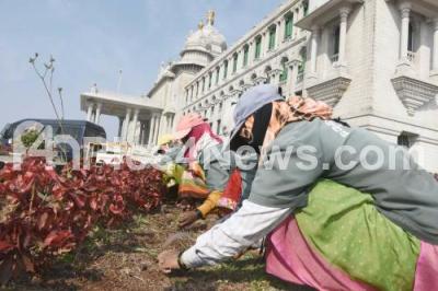 Photo Caption : Workers gardening at Suvarna Soudha Premises on the eve of Winter Assembly Session, in Belgavi on Sunday 7th December 2025