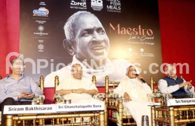 Photo Caption : Musical Maestro and Rajya Sabha Member Ilaiyaraaja with Chanchalapathi Dasa, Co-Founder and Vice Chairman, The Akshaya Patra Foundation, Shridhat Venkat, CEO, The Akshaya Patra Foundation during the press conference on Ilaiyaraaja 50 live in concert Bengaluru, at ISKCON, in Bengaluru on Monday 15th December 2025