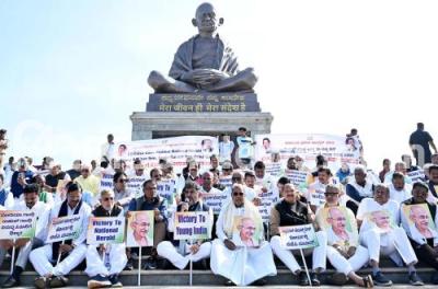 Photo Caption : Chief Minister of Karnataka Siddaramaiah with DCM DK Shivakumar, MLAs, MLCs and Congress leaders staging a protest at Mahatma Gandhi Statue, Suvarna Soudha, condemning the ED false case against Congress leaders including Sonia Gandhi and Rahul Gandhi in the National Herald and Young India cases, in Belagavi on Wednesday 17th December 2025